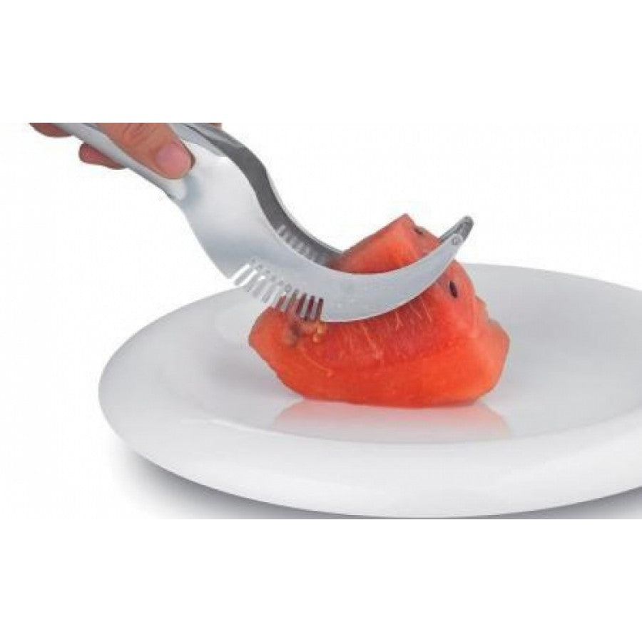 Vă prezentăm cuţitul special pentru tăiat şi servit pepene. Pentru a vă bucura de dulceaţă şi prospeţimea unui pepene savuros fără să faceţi mizerie în toată bucătăria când îl pregătiţi pentru masă. Doar tăiaţi pepenele pe din două şi restul – de la feliat şi până la servit - face cuţitul special.Beneficii:· Uşor şi precis – extrage mizeul dintr-o mişcare;· Rezistent – din oţel inoxidabil;Conţinut pachet:· 1 x Cuţit special pepene