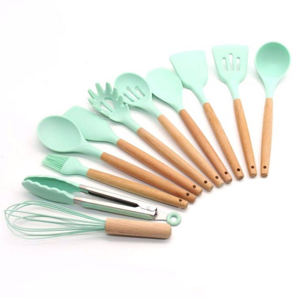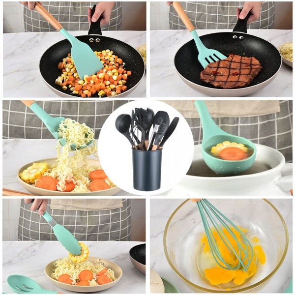 Setul include 11 ustensile pentru gatit confectionate din silicon care se vor potrivi tuturor nevoilor dumneavoastra. Acesta este rezistent la caldura si nu este toxic.