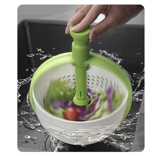 Cosul spinner pentru salata verde este conceput pentru a va pastra mancarea inauntru.
