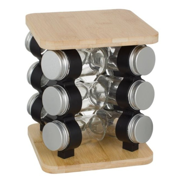 Suport rotativ din lemn cu spatii pentru 12 recipiente. Contine recipiente din sticla de 4x9.5 cm cu capac metalic insurubat pentru condimente si ierburi uscate.