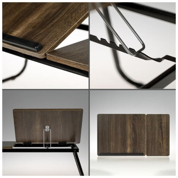 Masa de pat din lemn , cu cadru si picioare metalice. Suprafata este impartita in 2 parti , fixa de 18x33 cm si inclinata de 37.5x33 cm cu opritor din plastic. Pe aceasta parte va puteti pune cartea, laptopul sau tableta. Picioarele se inchid pentru o depozitare usoara.