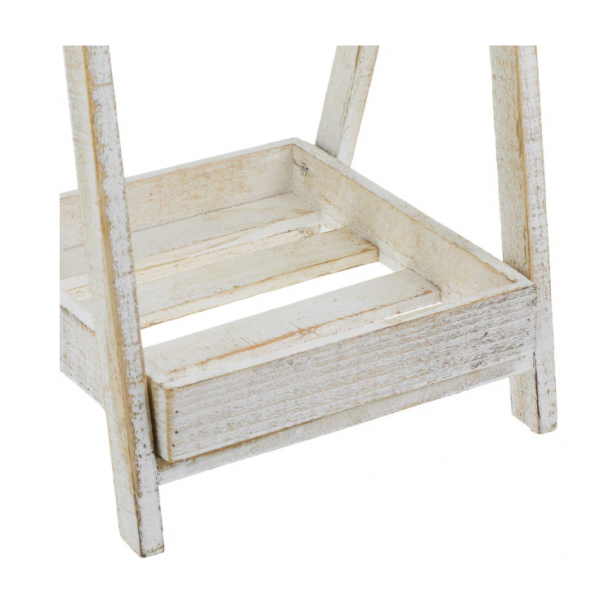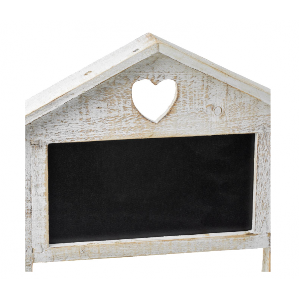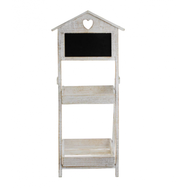 Suport decorativ din lemn vintage cu doua nivele pentru flori, de culoare alba, cu inima perforata. Rafturile au dimensiunile 25x25cm si 24x16cm. In partea de sus are o tabla neagra pentru a va scrie notitele.