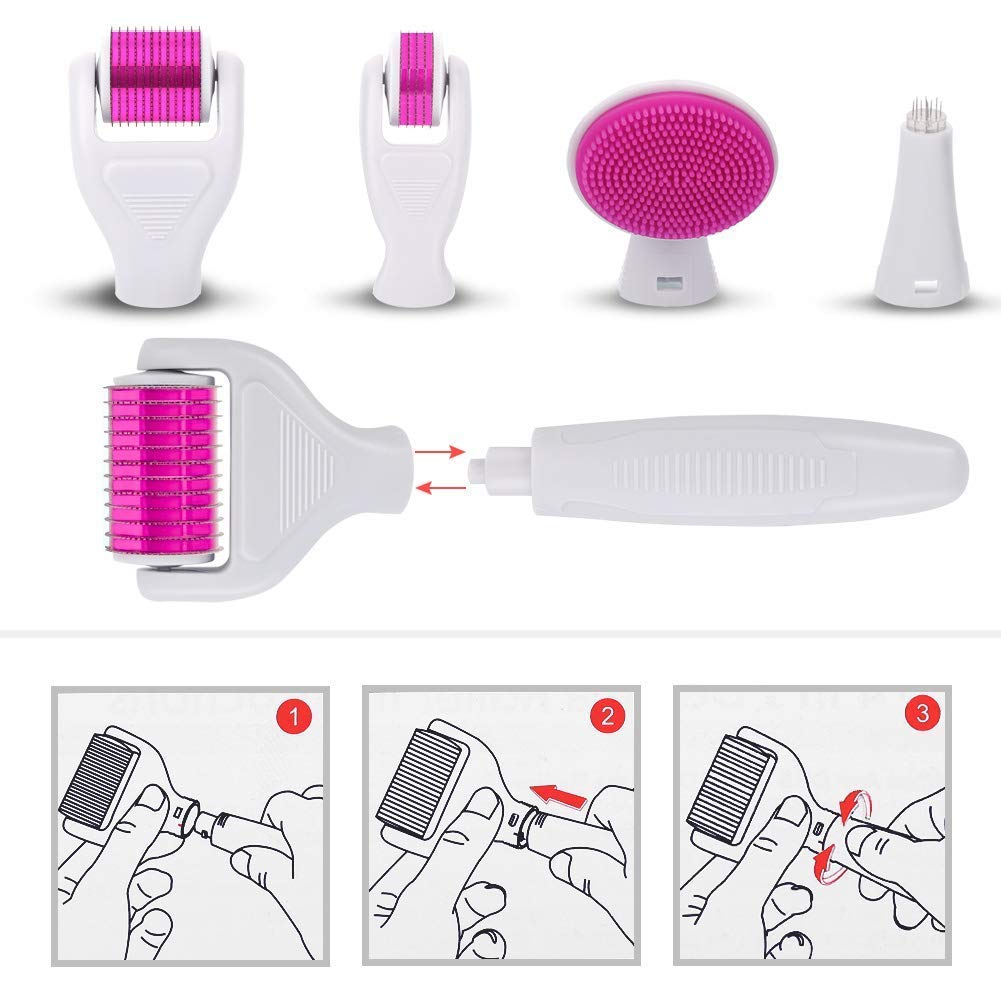 Rola DermaRoller este disponibila cu 5 capete de micro-ace diferite (1200 ace pentru corp, 720 ace pentru fata, 300 ace pentru ochi, capatul pentru topice, peria de