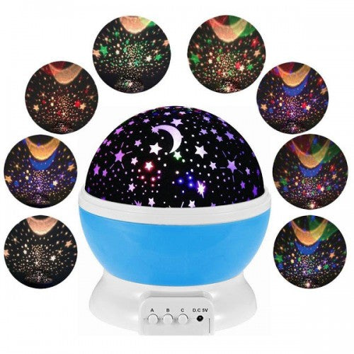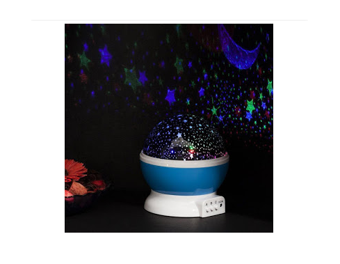 Lampa de veghe cu proiector rotativ cu stele si luna, cu functie de rotatie la 360 grade. Proiectorul este compus din 4 LED-uri de diferite culori.Din interiorul globului, lampa Star Master proiecteaza constelatii magice de stele pe tavanul si peretii dormitorului copilului, în 4 optiuni de culoare magica linistitoare: galben, albastru, verde si rosu. Aceasta lampa de veghe proiecteaza culori magice, astfel încât da posibilitatea copilului de a alege o culoare diferita, pentru proiectie, în fiecare noapte.Functia de rotatie la 360 de grade face ca globul care proiecteaza constelatia de stele si luna sa se roteasca non stop, lin si placut. Lampa are un buton prin care se poate porni sau opri aceasta functie de rotatie a globului proiector. Alimentarea se poate face în 3 moduri:- Cu 3 Baterii tip AA (1.5V) - NU sunt incluse.- Prin Cablul USB inclus care se poate conecta la un laptop (cablu este inclus în pachet).- Folosind un Adaptor de 5V (un încarcator de telefon) si cablul USB (adaptorul nu este inclus). Specificatii:- Proiectie de Stele si Luna cu lumini diferite noaptea pe tavan si pereti- Patru optiuni de culoare pentru lumina: galben, albastru, verde si rosu- Lampa de Veghe pentru Copii / Bebe- Lampa de Veghe Romantica- Buton de schimbare culoare- Buton pentru pornire/oprire rotatie 360 grade- Alimentare cu 3 baterii AA (nu sunt incluse)- Alimentare prin USB (cablu inclus) de la un laptop sau un încarcator de telefon Pachetul contine:- Lampa de Veghe si capacul de protectie al globului.- Cablu USB pentru alimentare