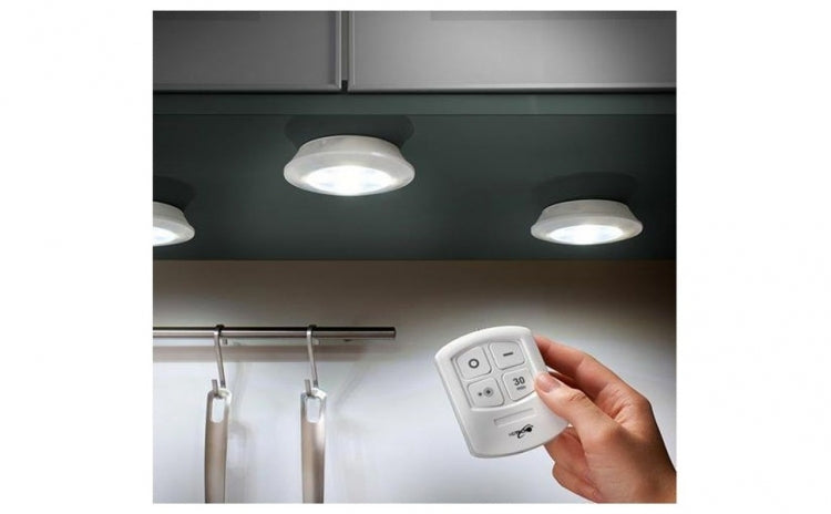 Set 3 lampi LED, 3 W, timer, telecomanda. Dimensiunile reduse, consumul redus de energie, capacitatea de montare aproape oriunde, designul atractiv sunt doar cateva dintre avantajele acestui set de 3 lampi cu LED si telecomanda. Datorita luminii puternice, consumului redus si a absentei firelor, lampa va fi o sursa ideala de lumina intr-un dulap, in bucatarie, in dormitor.- luminozitate: 150 lumeni;- telecomanda va permite sa reglati luminozitatea in 2 nivele;- puteti activa / dezactiva lumina pucului prin apasarea butonului de pe obiectivul luminilor;- instalare usoara;- utilizare: bucatarie, dulap, raft, garaj, subsol sau locuri similare intunecate.