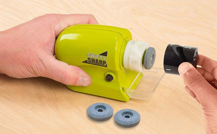 Noul ascutitor motorizat fara fir SWIFTY SHARP va da o noua viata cutitelor tale si nu numai.Obtine o a doua viata pentru cutite tale, foarfece si alte produse de uz casnic, cu Ascutitorul Swifty Sharp multifunctional fara fir si lama ascutitoare. Echipat cu piatra profesionista de mare viteza, The Swifty Sharp restabileste muchia de cutit pe orice lama in doar cateva secunde, de la cutite pentru foarfece pana la scule de mana mici- inclusiv surubelnite .Fie ca feliati carnea, taiati tesaturi sau tundeti gazonul, veti dori ca lamele cutitelor sa fie perfect ascutite. Spre deosebire de alte ascutitoare de cutite, acesta este complet sigur de utilizat, pentru ca mainile tale sunt intotdeauna departe de lama. Este mic si usor si de aceea poate fi pus intr-un sertar, dulap sau caseta de instrumente atunci cand nu va este necesar.Culoare: verde, dimensiuni: 15*9*6 cmNecesita 4 baterii de tip AA