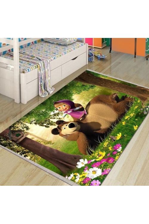 Covor Copii Antiderapant, Design Masha si Ursu, Verde/Maro/Mov 120x180 cm